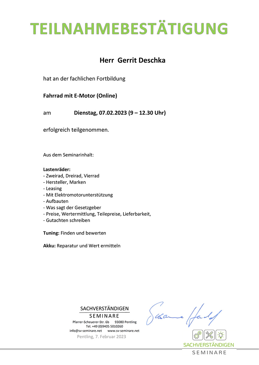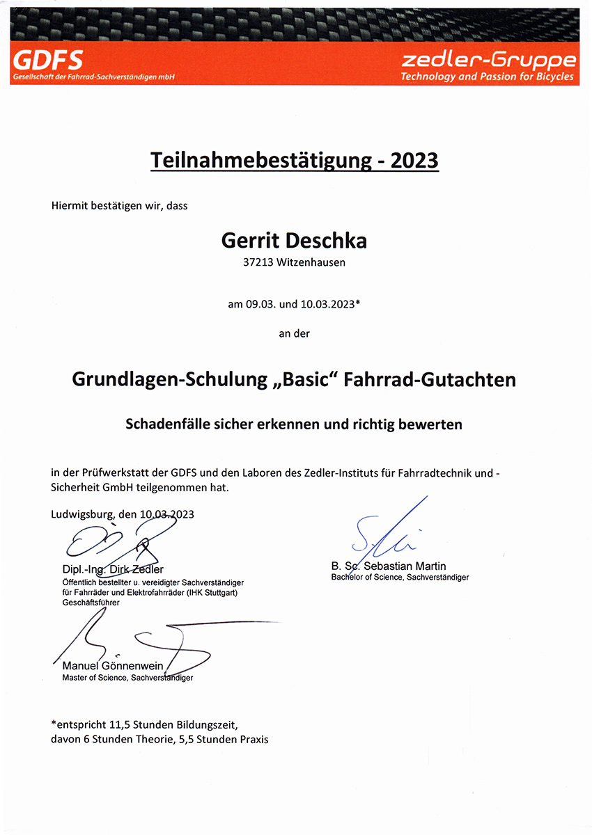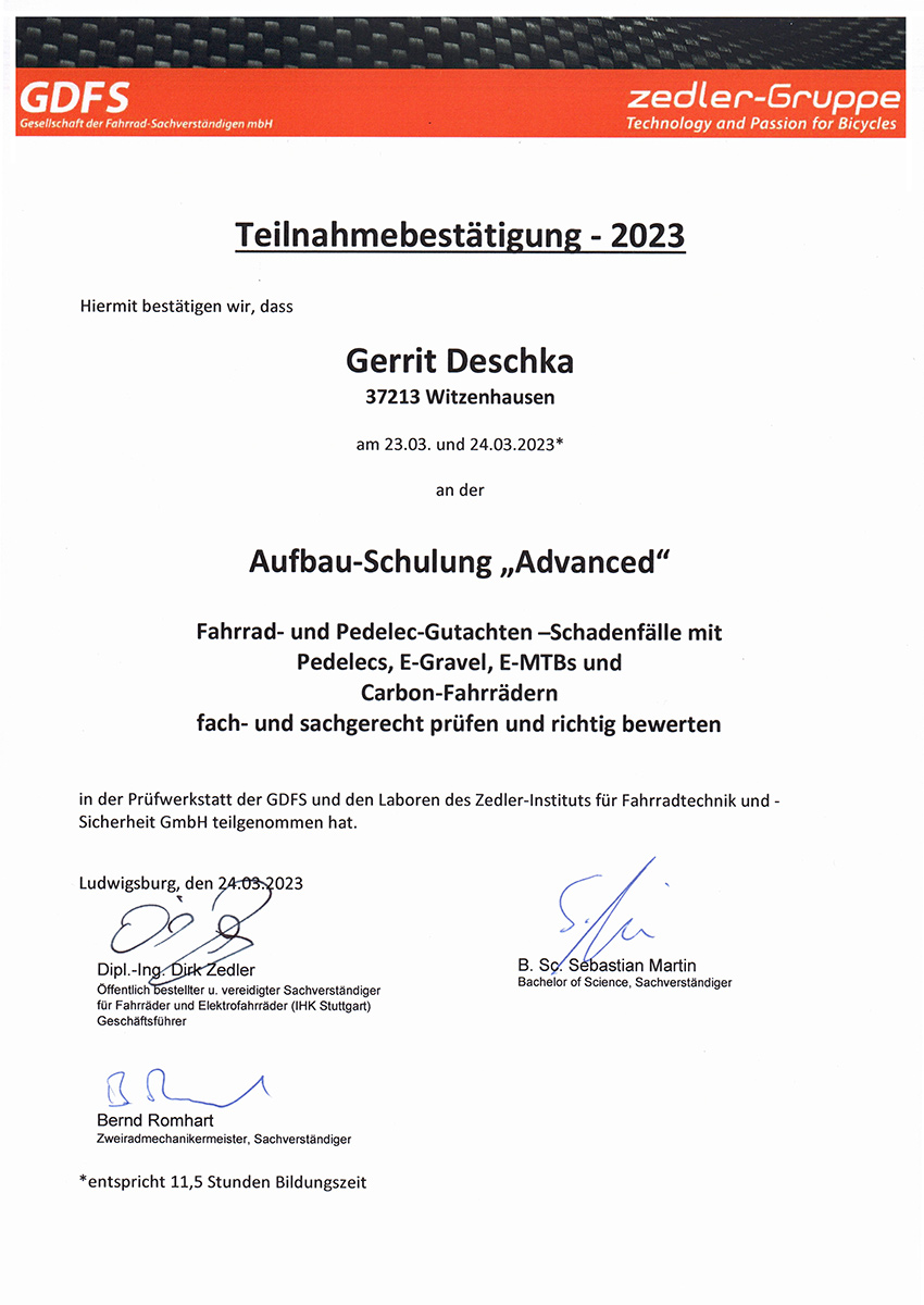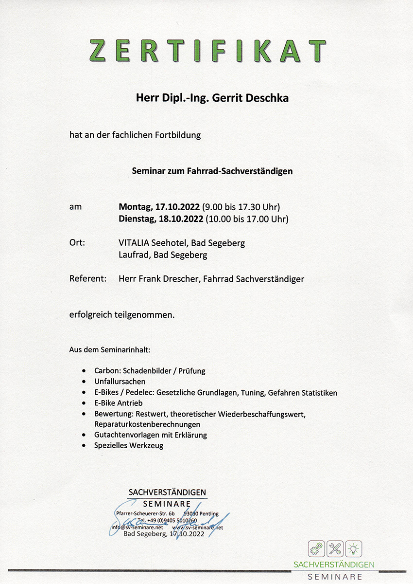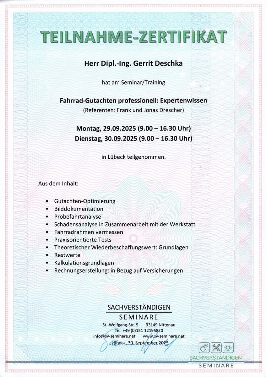 Unser Fahrradsachverständiger Herr Gerrit Deschka besucht regelmäßig Schulungen und Fortbildungen um im Fachbereich Fahrrad/E-Bike/Pedelec stets up to date zu sein.